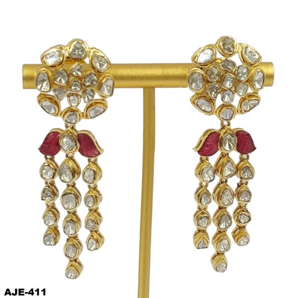 Polki jewellery. The Earring is handcrafted in 14k gold & set with uncut natural diamonds and polki with beads of precious & semi-precious gemstones.